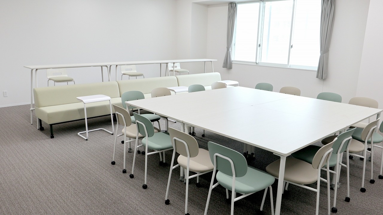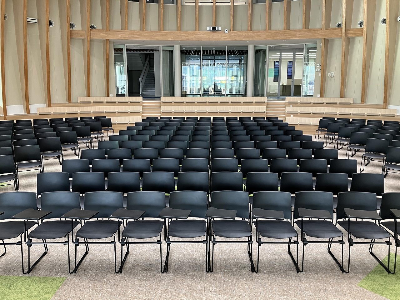 チェアを並べてホールとして活用します。そのため家具は移動がしやすいものを採用しています。