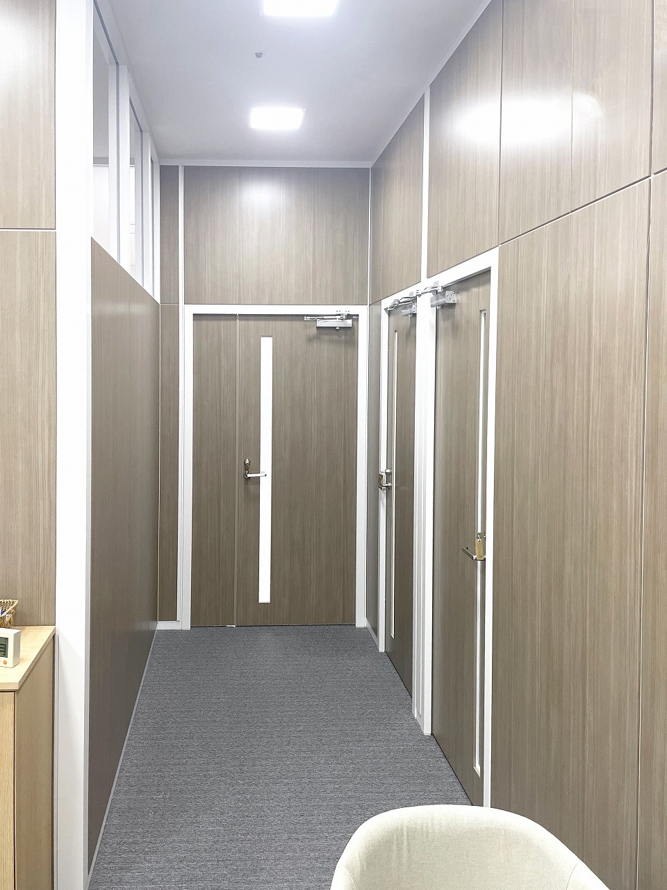 セキュリティに配慮するとともに、受付内は木調タイプの間仕切を採用して意匠性にもこだわっています。