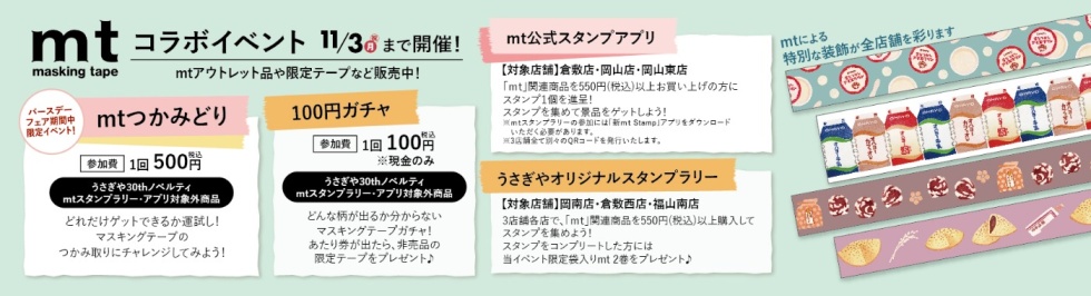 また、「うさぎや30th♡mt」の特別イベントとして、11月1日(土)から3日(月祝)の3日間、全店舗にてmtのつかみ取りを開催いたします。