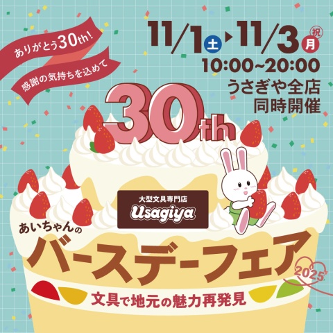 【プレスリリース】うさぎや開店30周年記念イベント 大型文具専門店うさぎや30th あいちゃんのバースデーフェア ~文具で地元の魅力再発見~