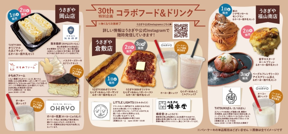 うさぎやの30周年を記念し、地元の有名企業さまとのコラボレーションによるオリジナル限定フード&ドリンクを販売いたします。