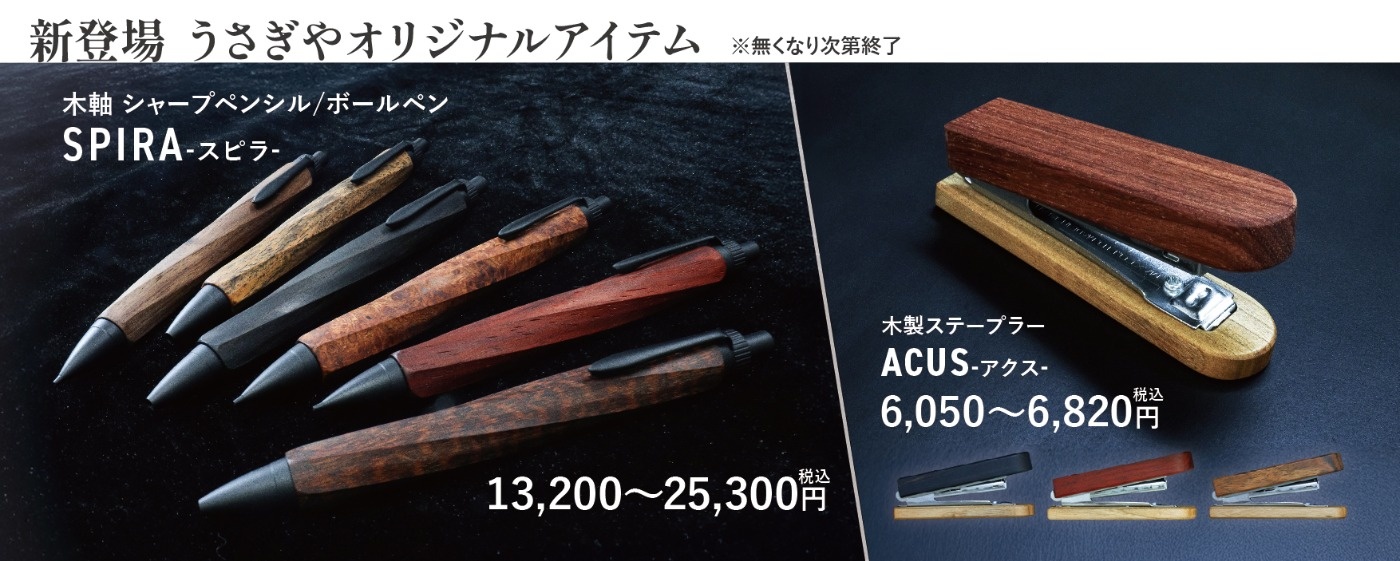 その一つがうさぎやオリジナル木軸のメカニカルペンシルとボールペン「SPIRA-スピラ-」、もう一つが、木製ステープラー「ACUS-アクス-」。