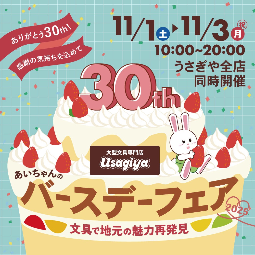 クラブン株式会社(本社:岡山県倉敷市)が運営する大型文具専門店うさぎやは、2025年11月1日(土)に開店30年を迎えます。