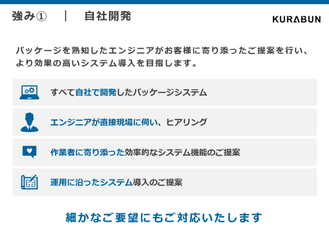 細かなご要望にも柔軟に対応し、実務にフィットするシステムを実現します。