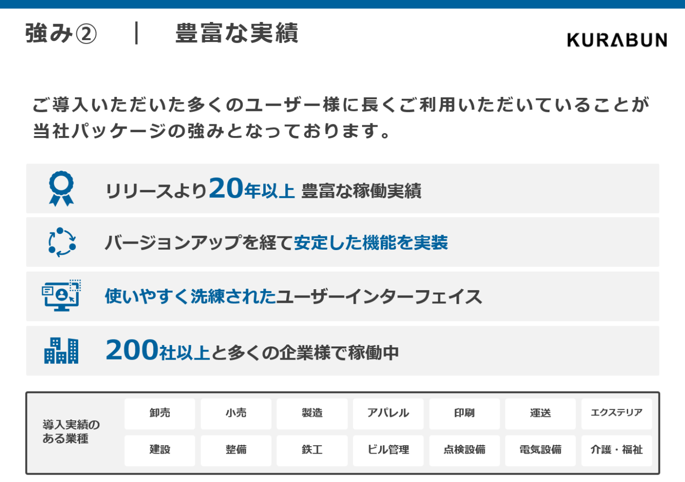 これまでに200社以上で稼働し、継続的なバージョンアップにより洗練されたユーザーインターフェイスと信頼性の高い機能を提供しています。