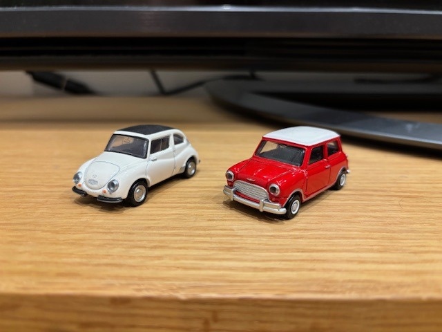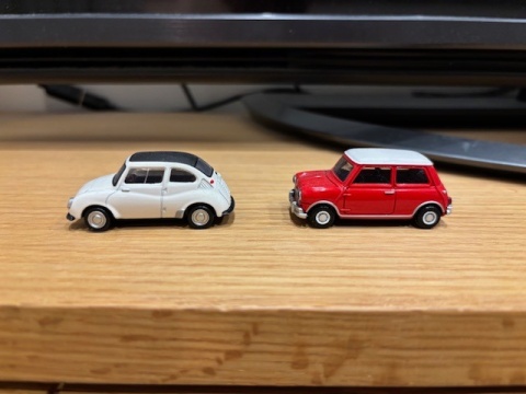 左からスバル360と、モーリス ミニ。
